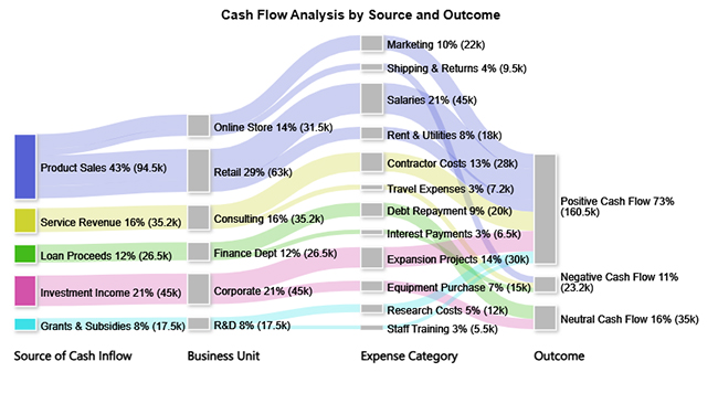 | Source of Cash Inflow | Business Unit | Expense Category | Outcome | Amount (USD) |