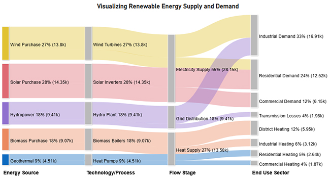• 55% of renewable energy flows into the electricity supply, making it the dominant channel.