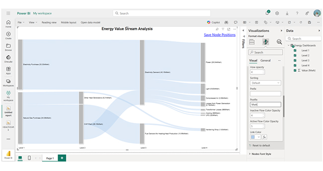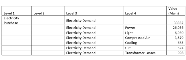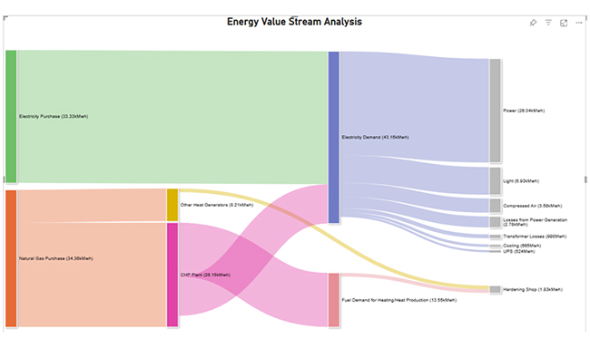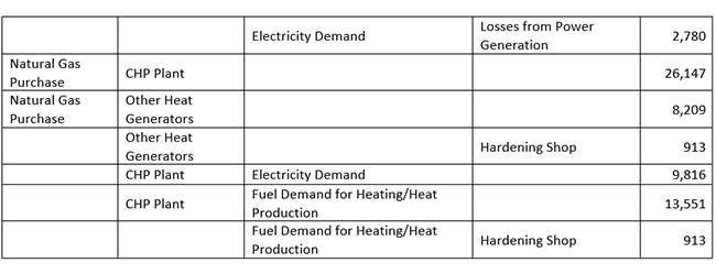 The data shows electricity and natural gas consumption across multiple categories. Power (26,035 MWh) dominates electricity demand, while CHP plants (26,147 MWh) drive gas usage. Furthermore, Transformer losses and generation inefficiencies show potential energy-saving opportunities.