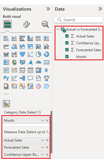 With the right joins in place, Power BI datasets from different systems can feed a single forecast view.