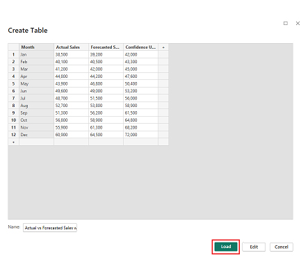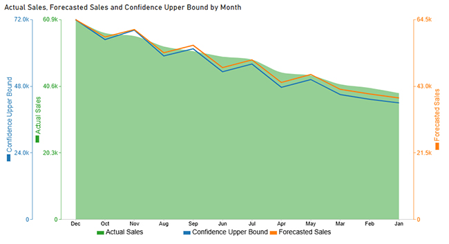 The table below shows monthly Sales alongside Forecast Sales, which is enough to demonstrate a multi-axis line chart.