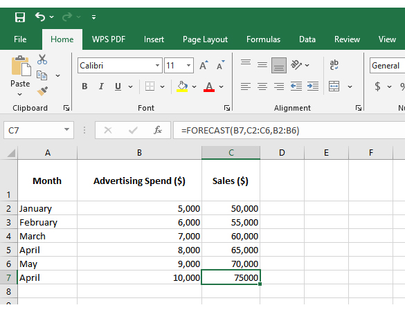 Assume we have data for advertising spend as our known x-values and sales figures as our known y-values. With this information, the FORECAST function can predict future sales. How? It will calculate an additional point along the straight line that best fits the given data.