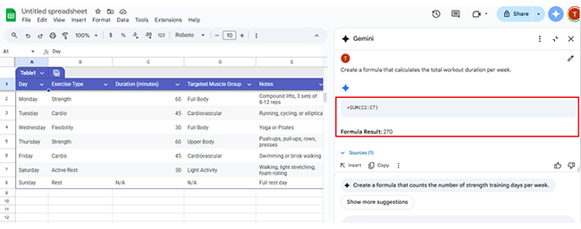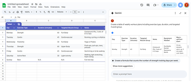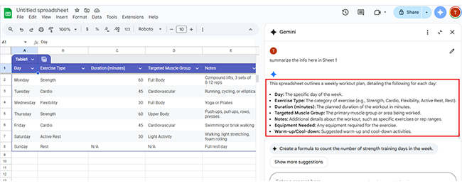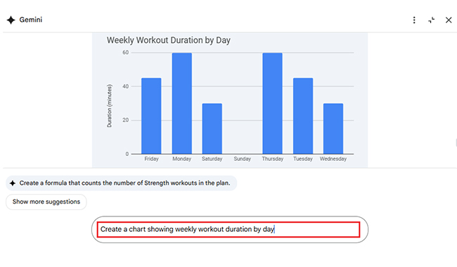 Charts don’t have to be hard. With Gemini in Google Sheets, they’re instant. Type a short prompt like “Show workout duration by day”, and Gemini will build the chart. It reads your data, finds what matters, and delivers clean visuals fast.