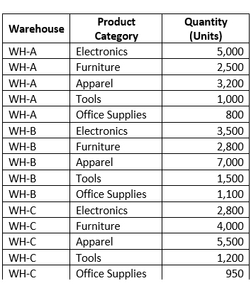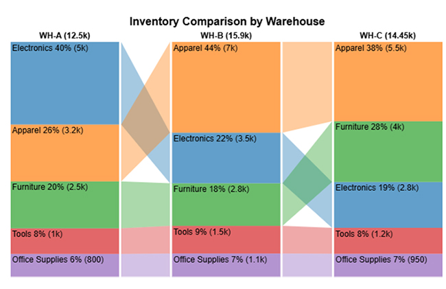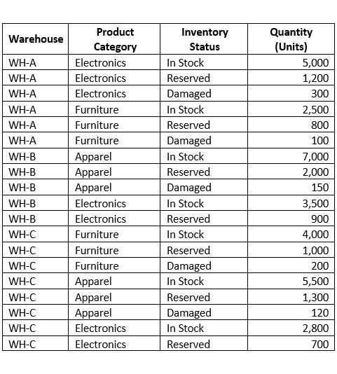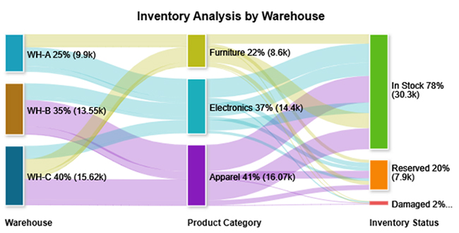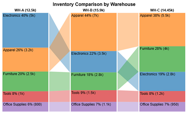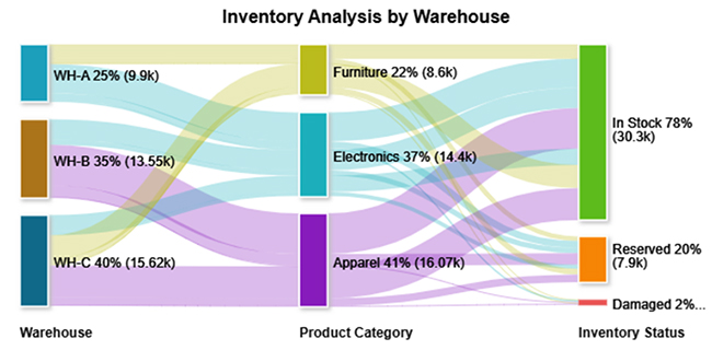 Inventory across warehouses is well-distributed with high in-stock levels, especially in Electronics and Apparel.