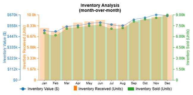 Inventory turnover dashboards track how quickly inventory is sold (or used) over some time. It provides insights into turnover rates and shows whether products are moving too slowly or too quickly. High turnover rates indicate popular products, while low turnover signals overstocked (or underperforming) products.