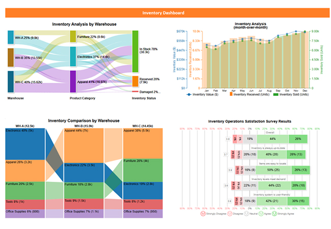 Inventory managers use these dashboards to track stock levels, monitor reorder points, and ensure that inventory is maintained at optimal levels.