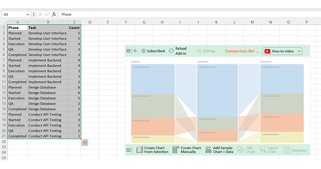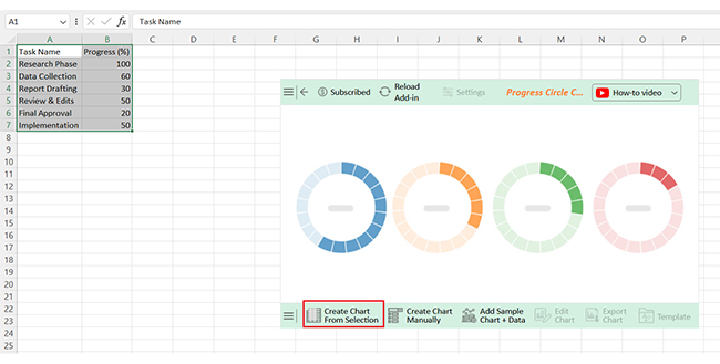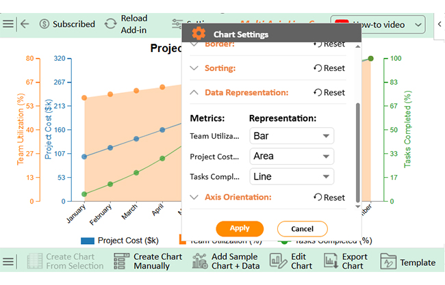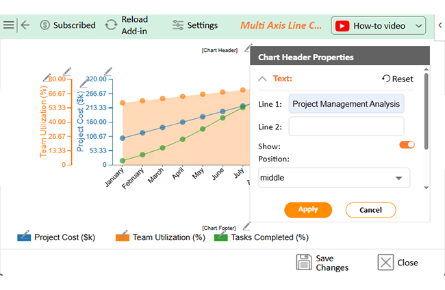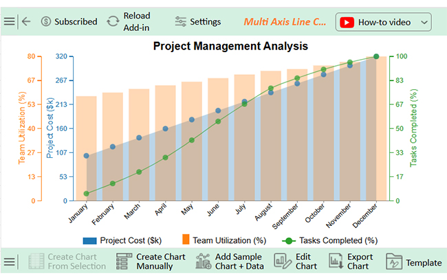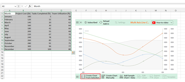 • First, paste the data into Excel, select the Multi Axis Line Chart, and click on the “Create Chart From Selection” button as follows:
