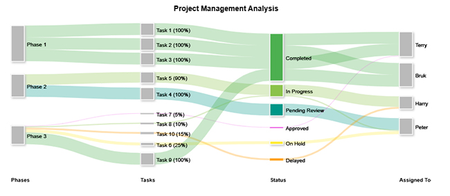 • Terry and Bruk have completed most tasks; Peter and Harry have multiple ongoing or delayed items.