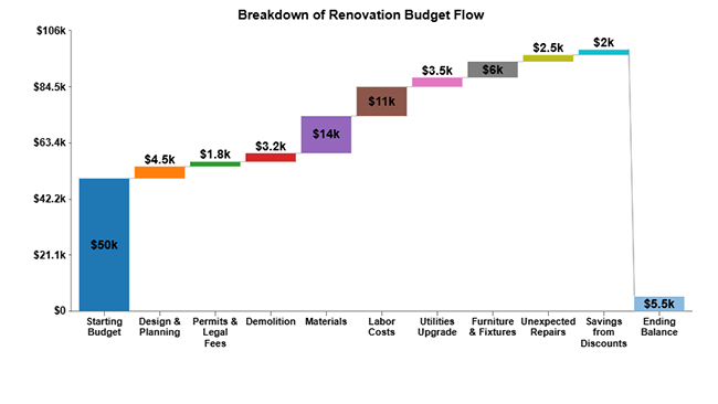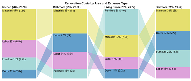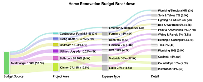 A Sankey Chart is perfect for visualizing how money flows in a project. It shows the path of funds from one category to another, making it easy to see where your renovation budget is going. For example, you can track how a total budget splits between labor, materials, permits, and unexpected costs.