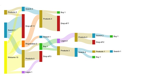 Each line, or “flow,” connects a source to a destination, and its width shows the proportion or volume of data being transferred. This makes it easy to understand how resources, users, or values move through a process from start to finish.