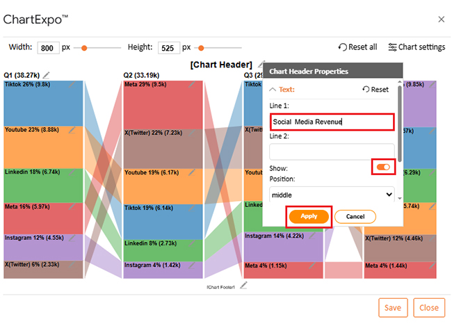 • It will open the properties dialog. Under the Text section, you can add a heading in Line 1 and enable the Show option. Give the appropriate title of your chart and click the Apply button.