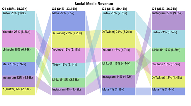 • X (Twitter): Grows from 6% in Q1 to 24% in Q3, then dips to 12% in Q4.