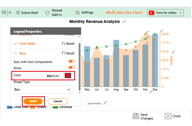 • You can also change the box appearance by selecting the pencil icon from the chart footer menu. After the Legend Properties window appears, click in the “Box” and select “Circle” from the Shape type. You can add color as well: