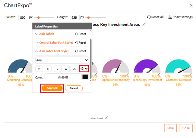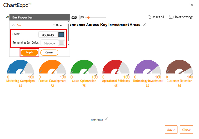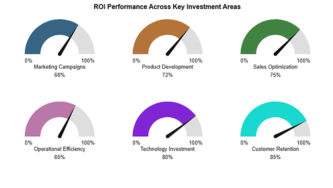The Gauge Chart highlights how key investment areas are progressing toward their ideal ROI targets, clearly showing strengths and improvement opportunities.
