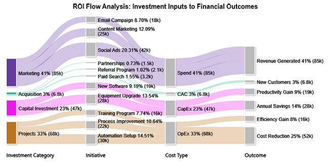 The Sankey chart shows how business investments flow across different expense categories, clarifying resource allocation and ROI impact.