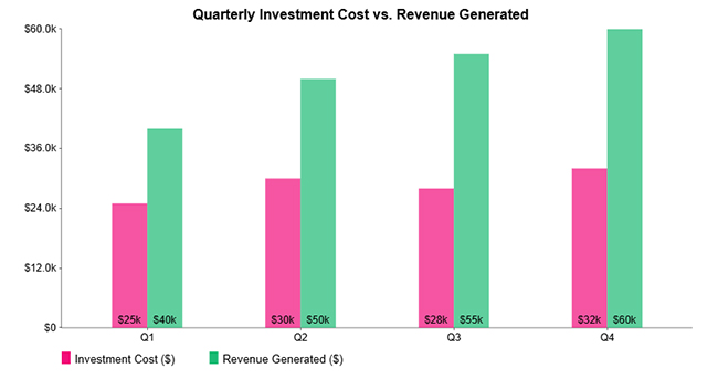 The Clustered Column Chart compares quarterly investment costs with generated revenue to highlight ROI performance trends.