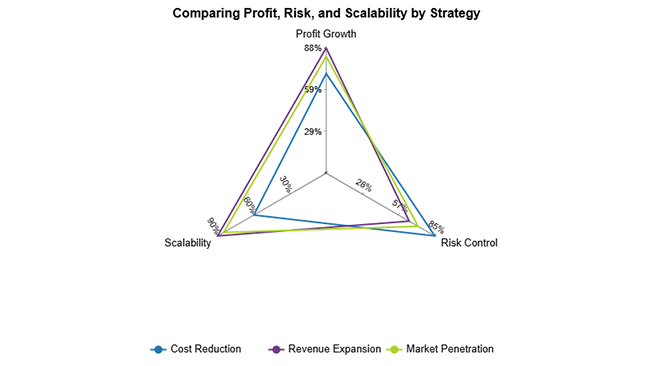 The Multi Axis Spider Chart compares investment strategies across profit growth, risk control, and scalability to support ROI-focused evaluation.